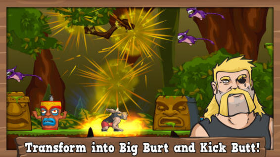 当你刚开始操作这款游戏时或许觉得它很普通,和很多横版过关一样,我们的目标就是让主角吃到多的硬币直到终点。不过当你玩过两、三关后,你肯定会改 变对这款游戏的看法。《Burt Destruction》中设置了很多颇具趣味的小细节。例如金币的作用并非只是积分这么简单,在主角吃到一定金币数量后会变身为 狂暴状态,这时可以揍扁路上的一切怪物,所以我们在游戏时可以把主角吃的到金币存到临界点,然后到危险的时候再吃满以达到可控化的变身,虽然说起 来很简单,但是做起来却不是那么容易的。
