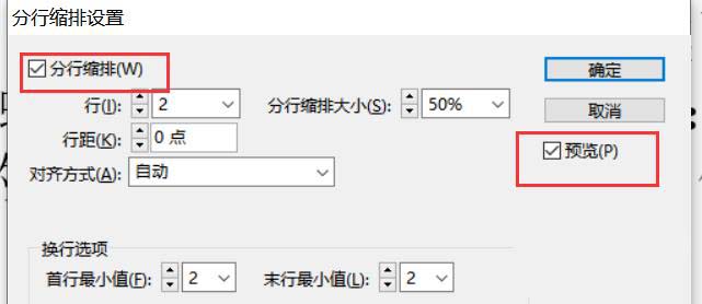 4、打开分行缩排设置选项,里面的分行缩排的行选项,控制缩排后的文字行数,若输入数值3,则会产生3行缩排文字;